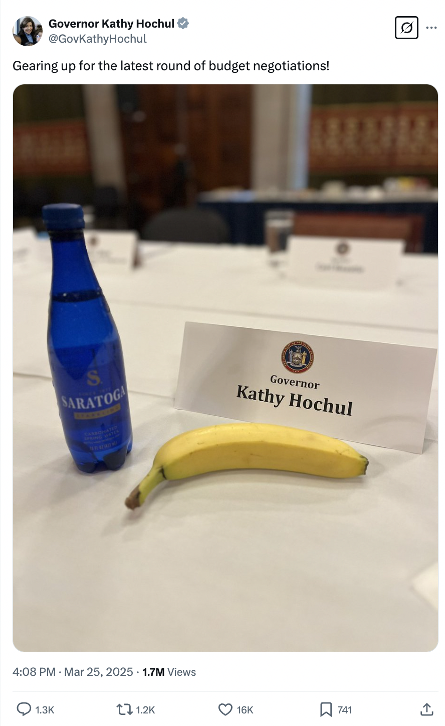 It's a photo of a bottle of Saratoga Spring Water and a banana next to a place card with the governor's name, captioned, "Gearing up for the latest round of budget negotiations!"