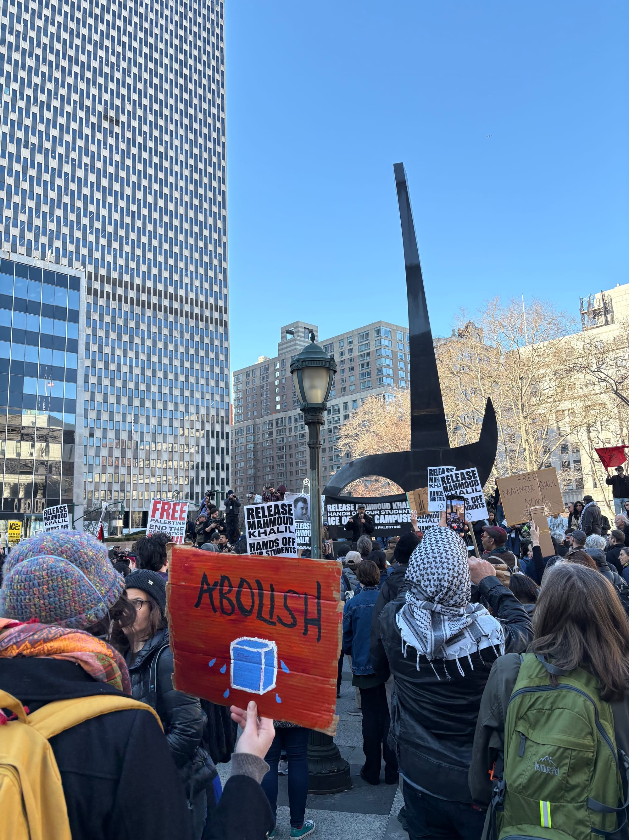 On Monday afternoon, thousands of New Yorkers in keffiyehs, face masks, and light jackets gathered in Foley Square to demand the release of Mahmoud Khalil, the recent Columbia University graduate arrested by federal immigration authorities on Saturday night and shipped to a Louisiana immigration detention center for the non-crime of being outspokenly pro-Palestinian on his former campus.