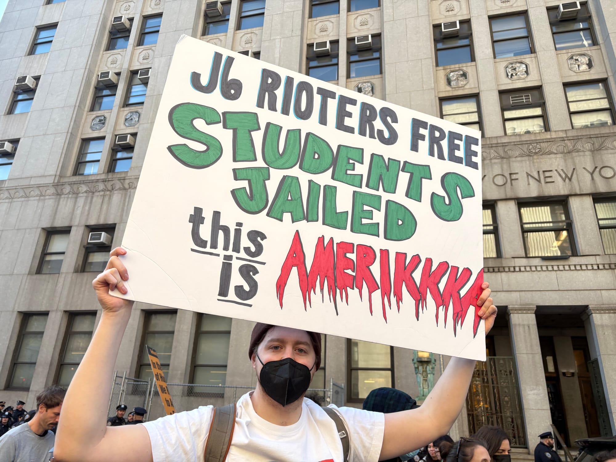 The New Yorkers we spoke to were angry and energized by the urgency of the moment and the cruelty of the situation. Nassim Zerriffa, attending the protest with his friend Catalina, told Hell Gate that as a middle school history teacher, he felt compelled to show up to the demonstration by the very things he tells his students in class.
