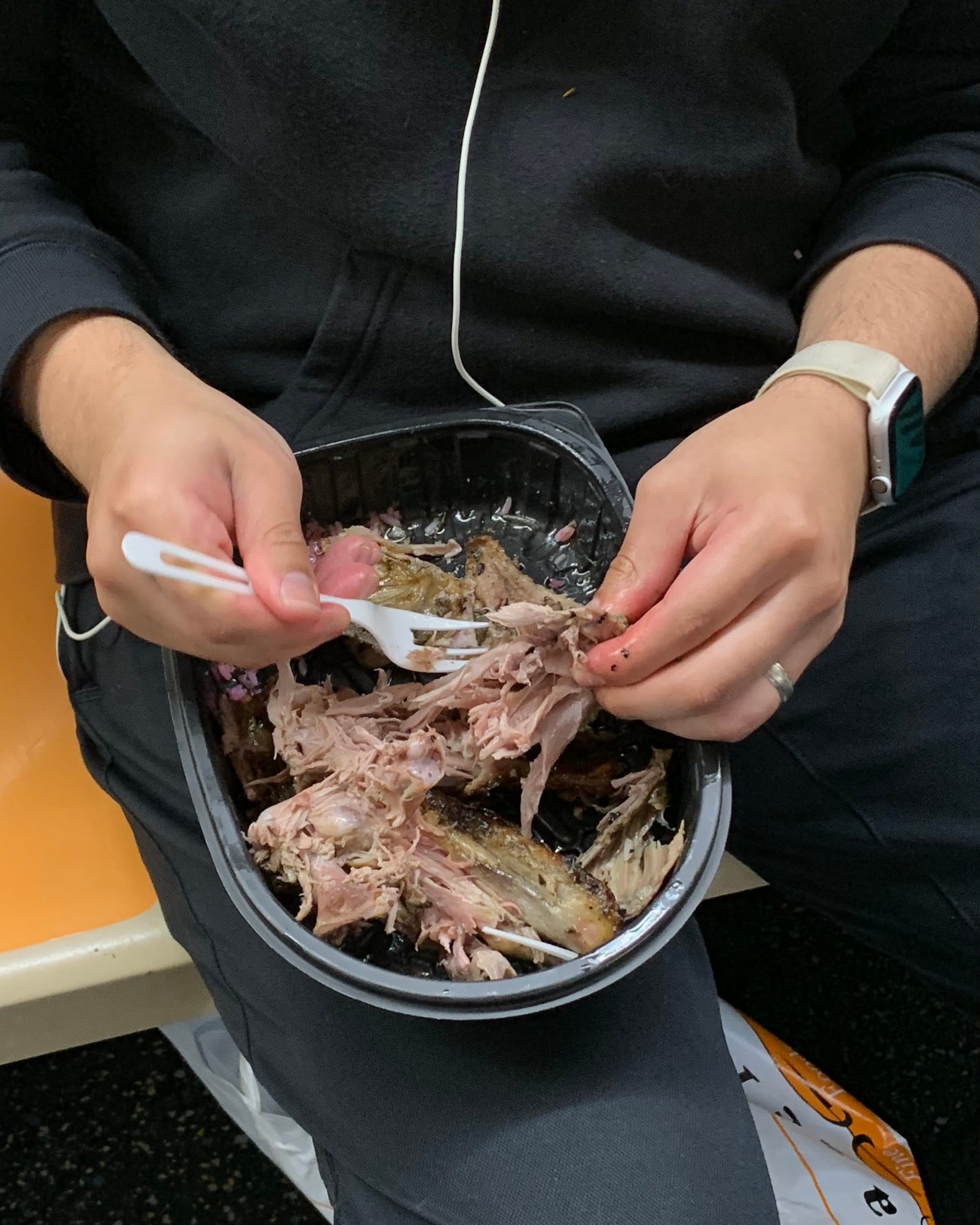 Ryan said that since releasing the zine (which is available for purchase via Instagram DM), she's encountered the full spectrum of train eating opinions—the major throughline being that everyone she talks to has a take. "I was at the bank yesterday, and when the banker was helping me, it came up that I'm a photographer. He asked what I was working on, and I mentioned 'Subway Schmutz,' and we had a really spirited discussion about the ethics of eating on the subway," she told Hell Gate. "He was born and raised in Brooklyn, and he was like, 'Of course you can eat on the train. People who are from New York get that.' But then he was like, 'Well, you can't eat crab legs with your hands on the train.' And I told him it was funny he mentioned that because one of my contributors did witness that."