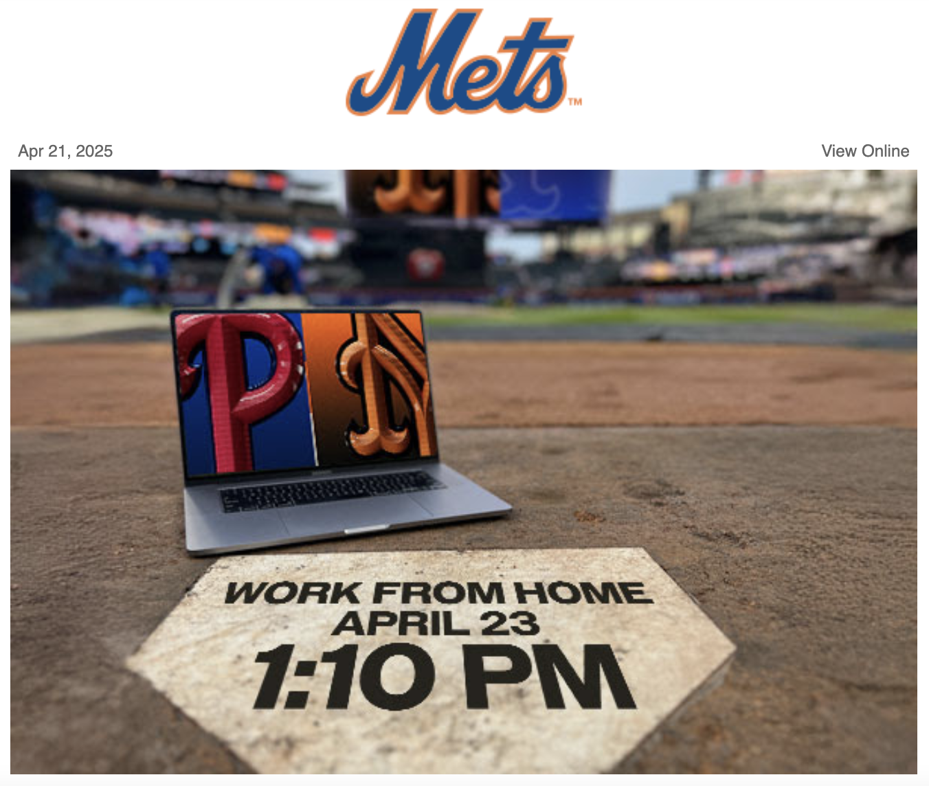On Monday, when the Mets marketing team emailed fans an invitation to "Work from Home Plate"—touting the beautiful weather, an image of a laptop next to home plate, and affordable tickets for the getaway day Wednesday matinee game against the Phillies—they were reading the room correctly.